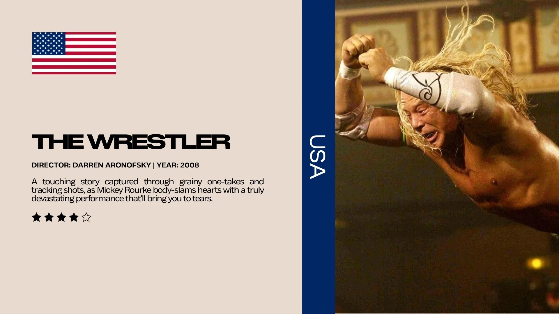 Synopsis: A faded professional wrestler must retire, but finds his quest for a new life outside the ring a dispiriting struggle.