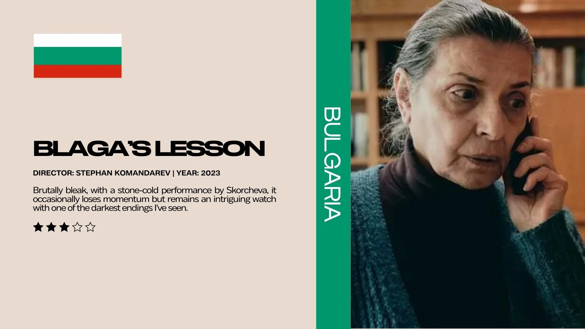 Synopsis: Blaga is a seventy-year-old recently widowed former teacher and a woman of firm morals. When telephone scammers con her out of the money that she had saved for her husband’s grave, her moral compass slowly begins to lose its bearings…
