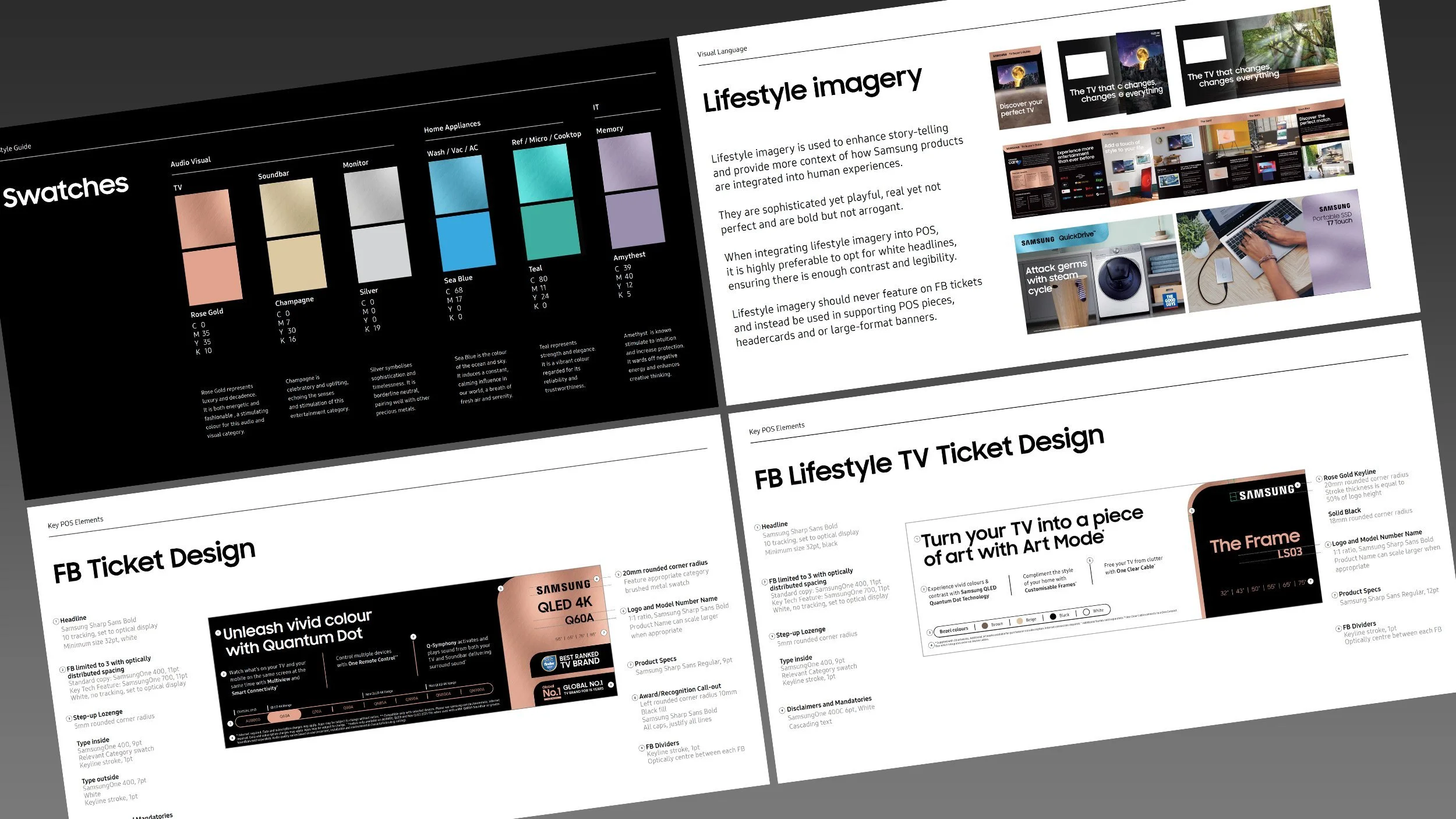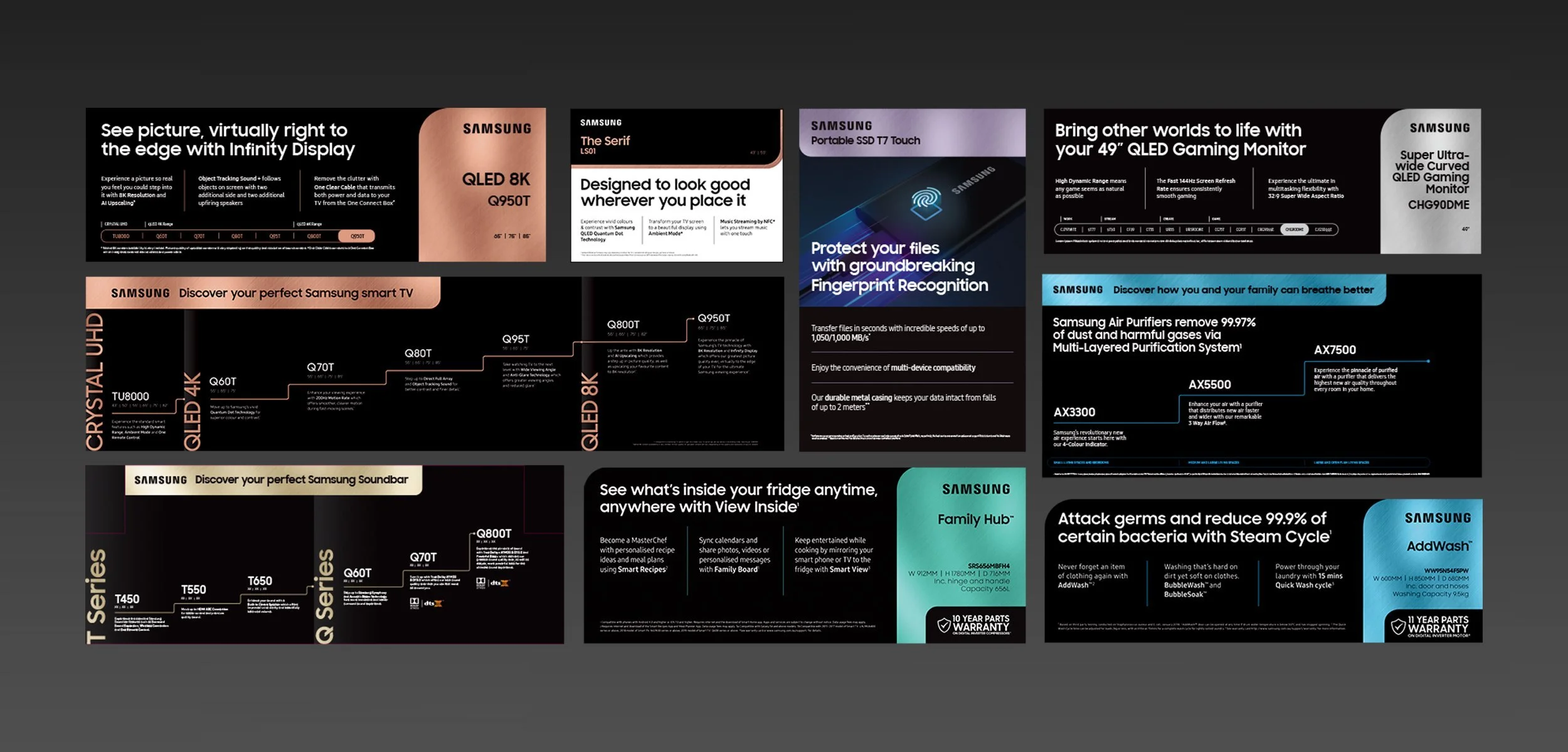 The retail experience for customers within the consumer electronics space lacked excitement and precision. Brand communications were almost impossible to understand due to the heavy use of tech jargon and the presence of too many disparate pieces of POS with different messages. Most significantly, the lifestyle benefits consumers are seeking to understand are hard to identify among all the ‘tech noise’. Samsung wanted to revive its POS suite and deliver a new communication approach for the retail store environment with relatable messaging that clearly explained the lifestyle benefits of Samsung technology using emotive, inspiring, non-techy, and human-centred language.